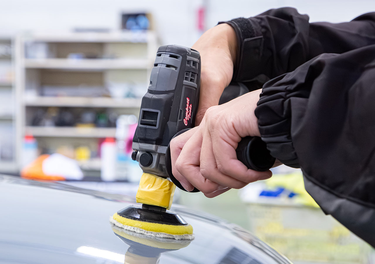洗車後、専用機材を用いて車のボディ表面を丁寧に磨き上げます。浅いキズやくすみを除去し、塗装本来のツヤを引き出す工程で、コーティング前の下地処理としても重要です。